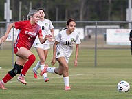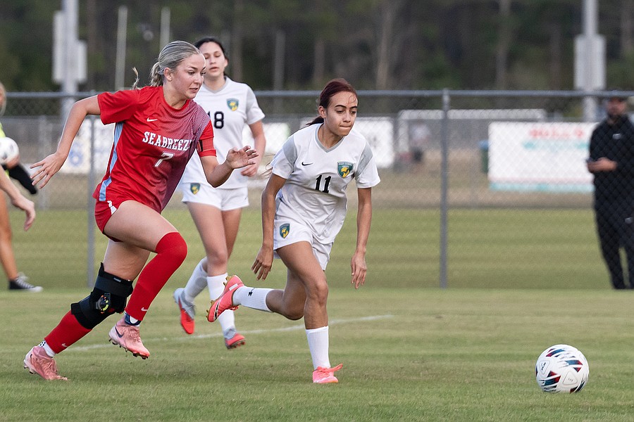Seabreeze striker Liv Chase (7) sprints toward the goal as Pine Ridge defender Liliana Deal (11) moves in for the ball during the District 6-5A semifinal on Thursday, Jan. 22 at the Ormond Beach Sports Complex. Photo by Michele Meyers