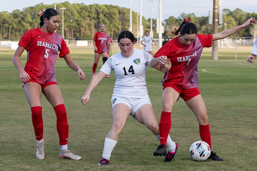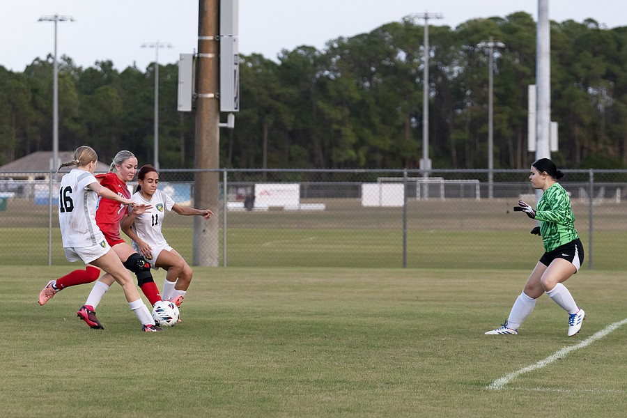 Seabreeze striker Liv Chase (7) fights Pine Ridge defenders Liliana Deal (11) and Kaylie Pilloud (16) as goalkeeper Jazleen Sanchez (right) protects the goal during the District 6-5A semifinal on Thursday, Jan. 22 at the Ormond Beach Sports Complex. Photo by Michele Meyers