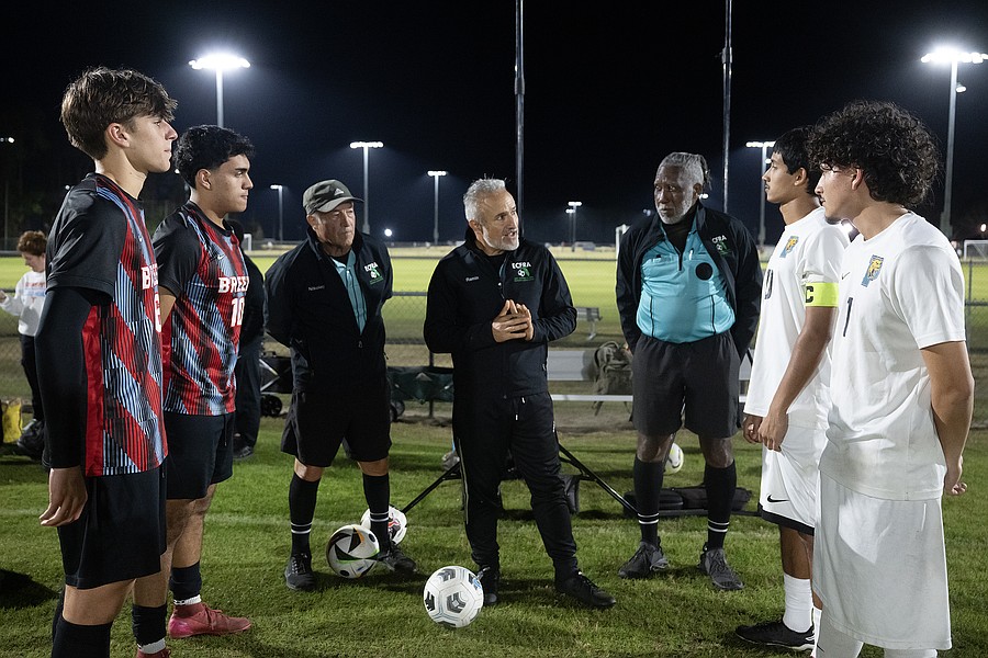 Seabreeze head coach Alex Perez goes over a few game details at the water break during the District 6-5A semifinal against Pine Ridge on Thursday, Jan. 22 at the Ormond Beach Sports Complex. Photo by Michele Meyers