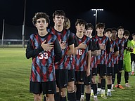 The Seabreeze boys soccer team stands at attention as the natinal anthem is played before the District 6-5A semifinal against Pine Ridge on Thursday, Jan. 22 at the Ormond Beach Sports Complex. Photo by Michele Meyers
