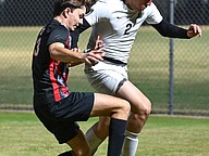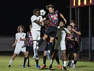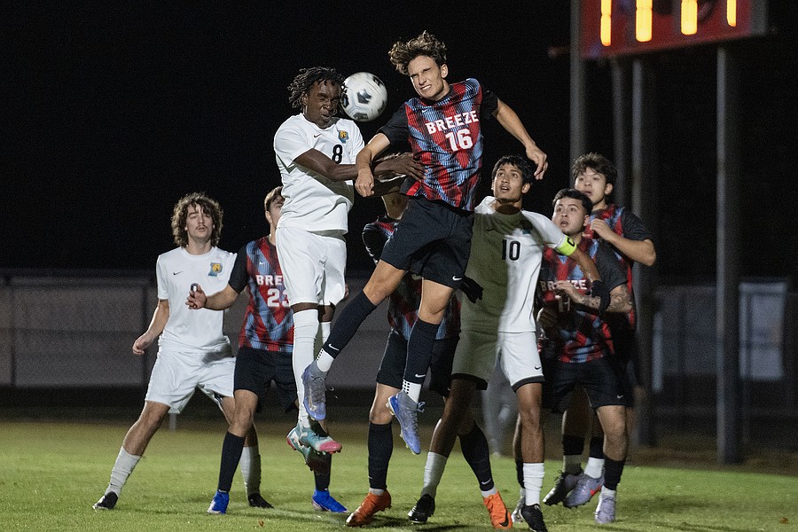 Seabreeze's Lane Myer (16) and Pine Ridge's Jaheim Blair (8) go for the header during the District 6-5A soccer semifinal on Thursday, Jan. 22 at the Ormond Beach Sports Complex. Photo by Michele Meyers