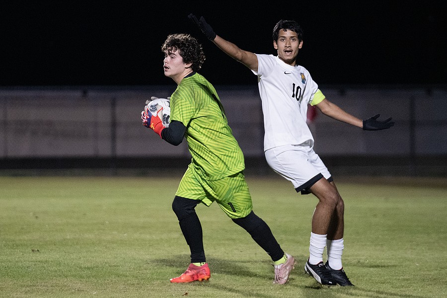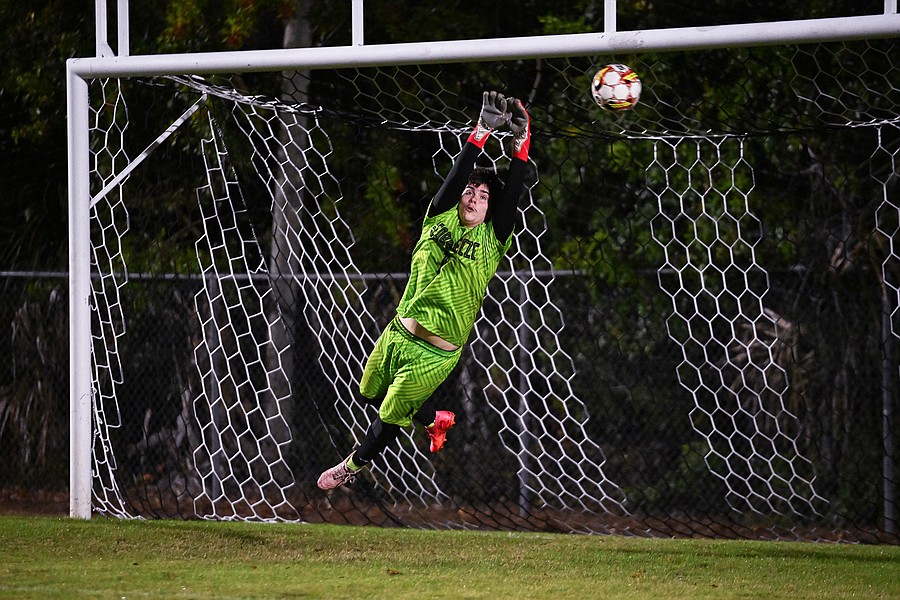 Seabreeze goalkeeper Chandler Klepper (left) makes the save as Pine Ridge complains about the call during the District 6-5A soccer semifinal on Thursday, Jan. 22 at the Ormond Beach Sports Complex. Photo by Michele Meyers