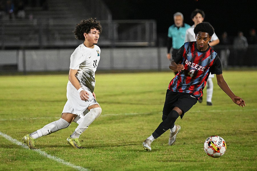 Seabreeze freshman Alejandro Mafara(4) passes before Pine Ridge captain Zachary Benitez (left) has a chance to challenge him during the District 6-5A soccer semifinal on Thursday, Jan. 22 at the Ormond Beach Sports Complex. Photo by Michele Meyers