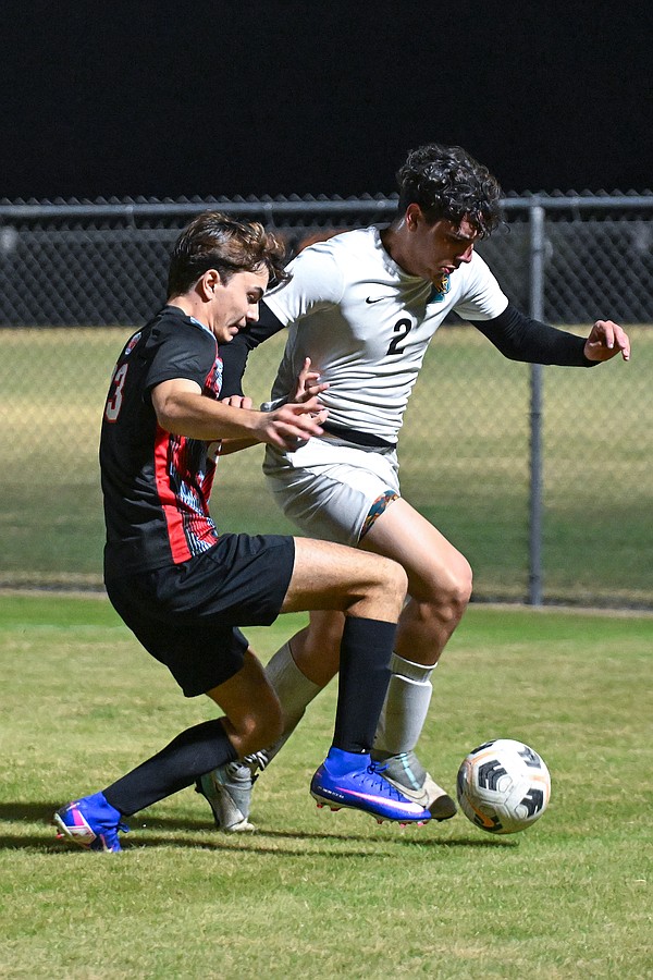It was a bttle in the corner between Seabreeze's Liam Piazza (left) and Pine Ridge's Gustavo Castillo (2) during the District 6-5A soccer semifinal on Thursday, Jan. 22 at the Ormond Beach Sports Complex. Photo by Michele Meyers