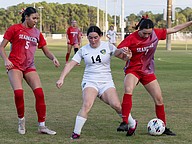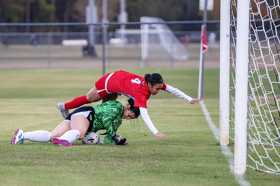 Pine Ridge goalkeeper Jazleen Sanchez saves Seabreeze's Addison Simpson's (center) goal attempt during the District 6-5A semifinal on Thursday, Jan. 22 at the Ormond Beach Sports Complex. Photo by Michele Meyers