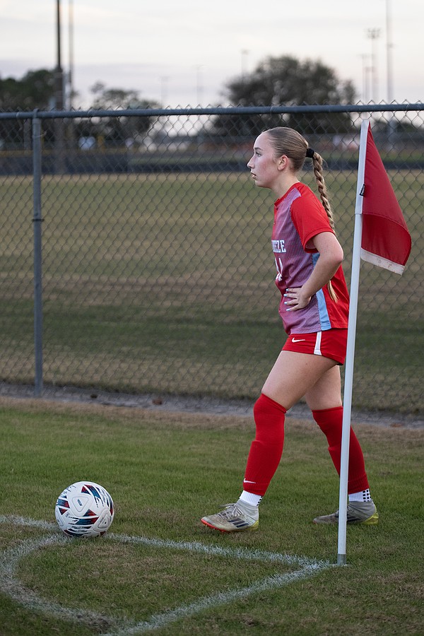 Seabreeze sophomore Addison Sanders takes a corner kick during the District 6-5A soccer semifinal on Thursday, Jan. 22 at the Ormond Beach Sports Complex. Photo by Michele Meyers
