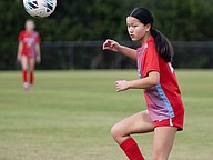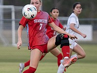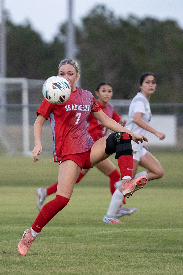 Seabreeze striker Liv Chase (7) grabs the cross during the District 6-5A semifinal on Thursday, Jan. 22 at the Ormond Beach Sports Complex. Photo by Michele Meyers