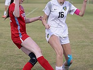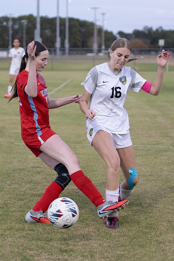 Seabreeze's Addison Simpson (left) and Pine Ridge's Katie Pilloud (16) battle for ball control during the District 6-5A semifinal on Thursday, Jan. 22 at the Ormond Beach Sports Complex. Photo by Michele Meyers