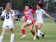 Seabreeze's Emily Chan (4) charges toward the goal as Pine Ridge goalkeeper Jazleen Sanchez saves the ball during the District 6-5A soccer semifinal on Thursday, Jan. 22 at the Ormond Beach Sports Complex. Photo by Michele Meyers