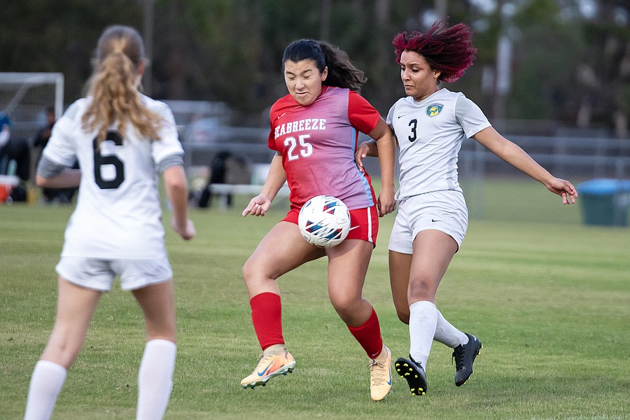Seabreeze's Sophia Mendoza (25) and Pine Ridge's Adrianna Bess-Queirolo (3) battle for the ball during the District 6-5A soccer semifinal on Thursday, Jan. 22 at the Ormond Beach Sports Complex. Photo by Michele Meyers