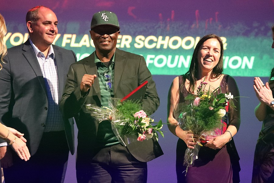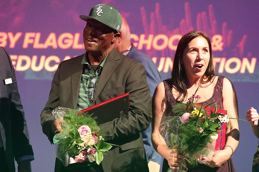 Flagler Palm Coast High School Campus Security Officer Calvin Grant and Belle Terre Elementary School ESE teacher Michelle Moore are named Flagler Schools Employee and Teacher of the Year. Photo by Brent Woronoff