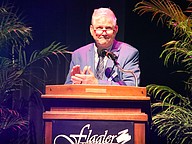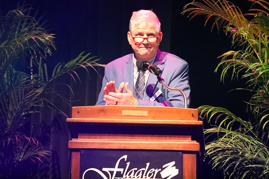Brade Martz, Flagler Schools' 2025 Employee of the Year, speaks at the gala. Photo by Brent Woronoff