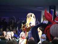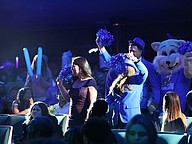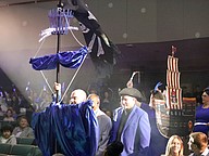 The entourage from Indian Trails Middle School, including the school's Mustang mascot, makes its way to the stage. Photo by Brent Woronoff