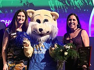 School Board member Lauren Ramirez and Flagler Schools Teacher of the Year Michelle Moore with the Belle Terre Elementary School Bobcat. Photo by Brent Woronoff