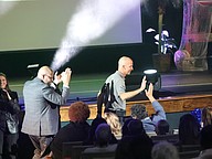 Mike Pane, Technology Employee of the Year, waves as he walks to the stage. Photo by Brent Woronoff