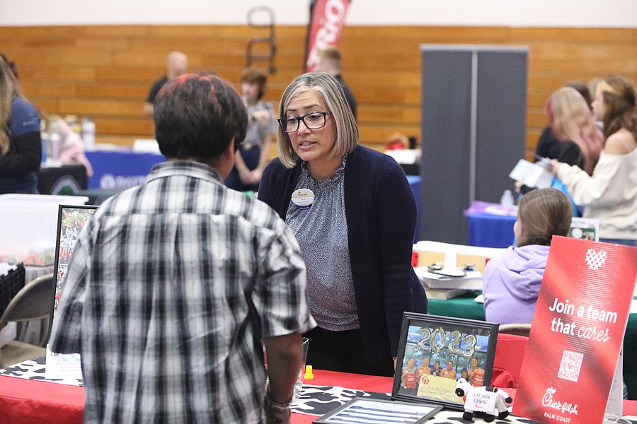 Ana Morales, the director of culture for the Flagler County Chick-fil-A restaurants, talks to a Buddy Taylor Middle School student. "The kids ask if we offer scholarships, which we do, and if they can grow with us. They can learn culinary, hospitality and management," Morales said. The local Chick-fil-A restaurants also sponsor Matanzas' tourism and hospitality class, she said. Photo by Brent Woronoff