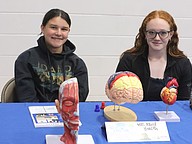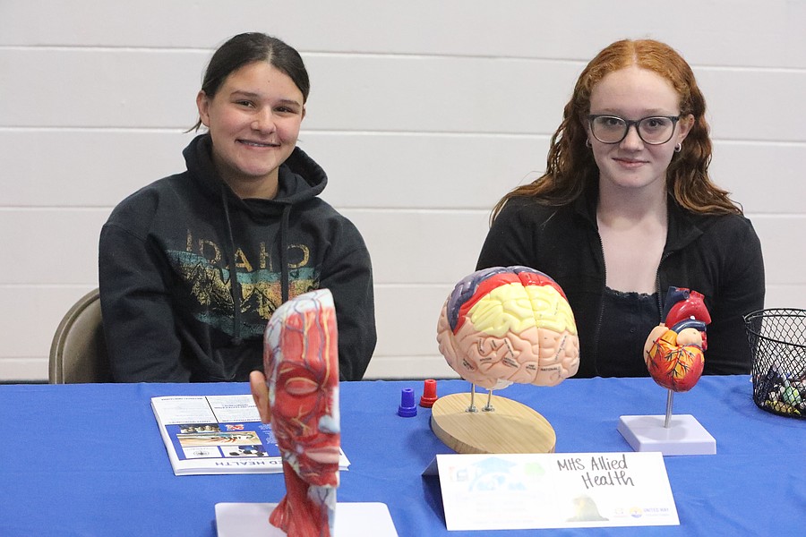 Natalie Beaulieu and Madelyn May represented the Matanzas Allied Health program. This is the first year the medical diploma-plus program is being offered at MHS. "It's really fun and interactive," Beaulieu said. Photo by Brent Woronoff