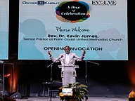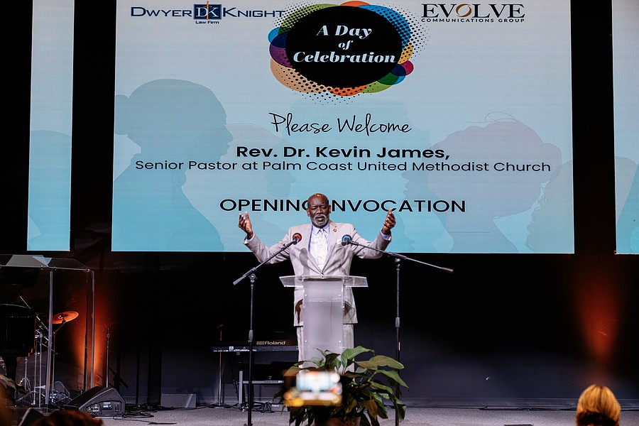 Rev. Kevin James, the senior pastor of Palm Coast United Methodist Church, delivers the invocation at "A Day of Celebration." Photo by Shauna McIntosh