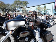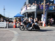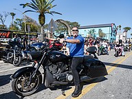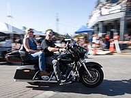 Teddy Morse, owner of Teddy Morse's Daytona Harley-Davidson, drives a Harley to center stage for the Rolling Daytona Bike Giveaway during the 85th annual Daytona Bike Week on Friday, Mar. 6. Photo by Michele Meyers