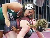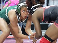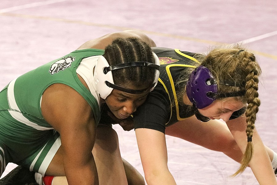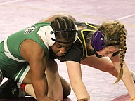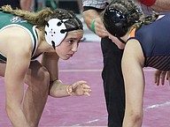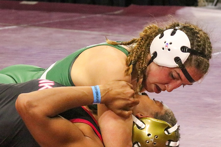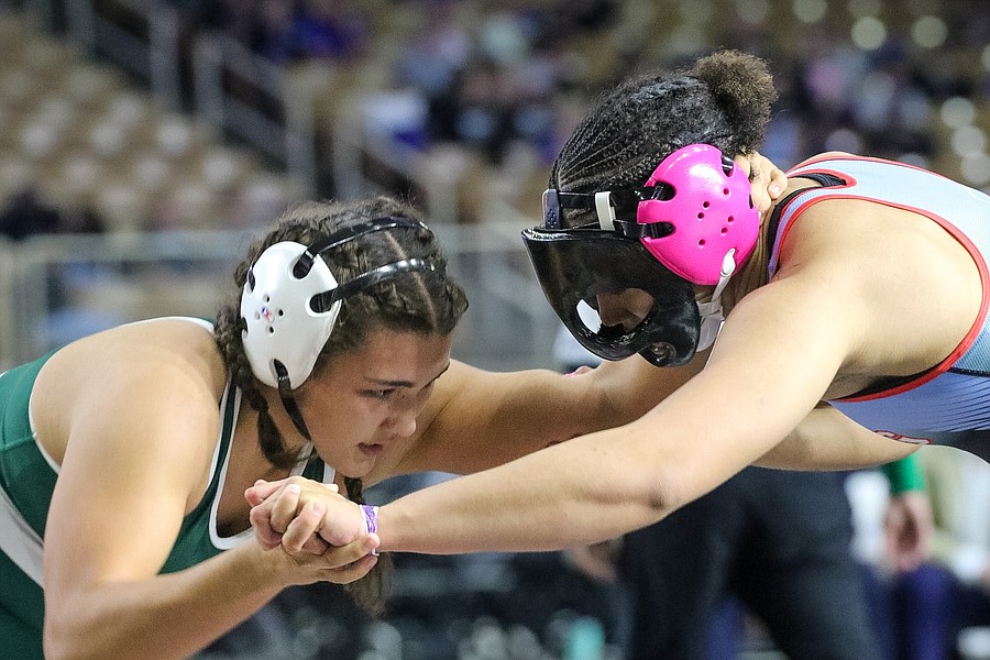 Alisha Vilar (top) placed third at 145 pounds in the girls state championships, with her only loss to eventual state champ, Ailee Briggs, who won her third state championship. Photo by Abe Mills