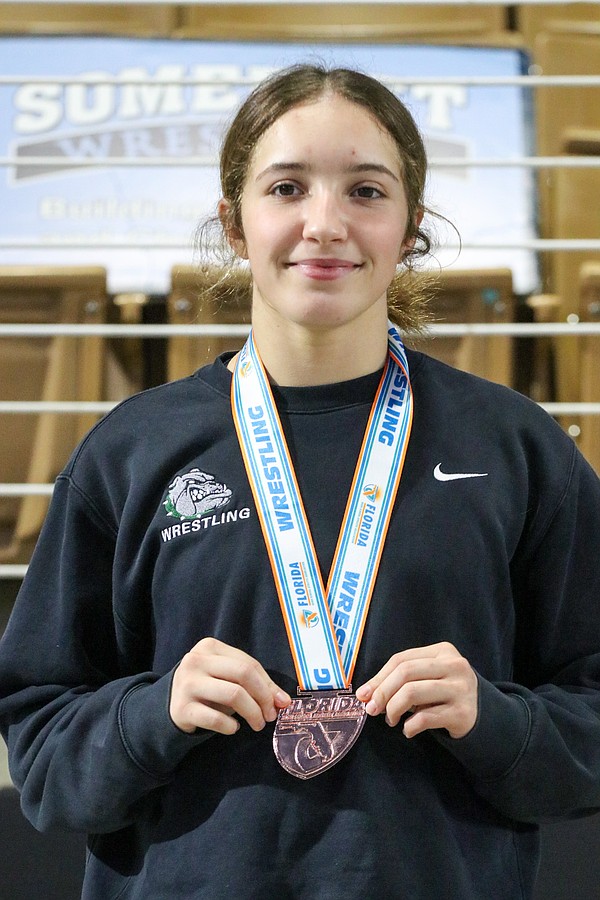 Vilar, a junior wrestling in her first state tournament, advanced to the girls’ 145-pound semifinals where she faced two-time state champ Ailee Briggs of Lemon Bay. Briggs pinned Vilar and went on to win her third consecutive state title. Vilar went on to pin both of her opponents in the consolation semis and the third-place match.
