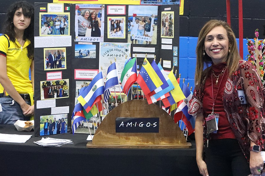Matanzas High School Spanish teacher Christina Gilliam (right) organized the Multicultural Festival. Noraly Dominguez (left) created the banners for many of the nations represented at the festival and designed and painted the AMIGOS food cart. Photo by Brent Woronoff