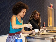 Kale Cafe owner Camille Holder-Brown and Bethune-Cookman University student Jala’ Delancy serve soup during Urban Ministries Empty Bowl 2026 fundraiser. Photo by Suzanne McCarthy