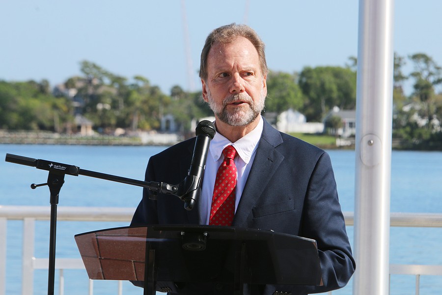 Volusia County Council Chair Jeff Brower speaks during the Vietnam Memorial Wall unveiling ceremony at Veterans Memorial Plaza on Friday, March 27. Photo by Jarleene Almenas