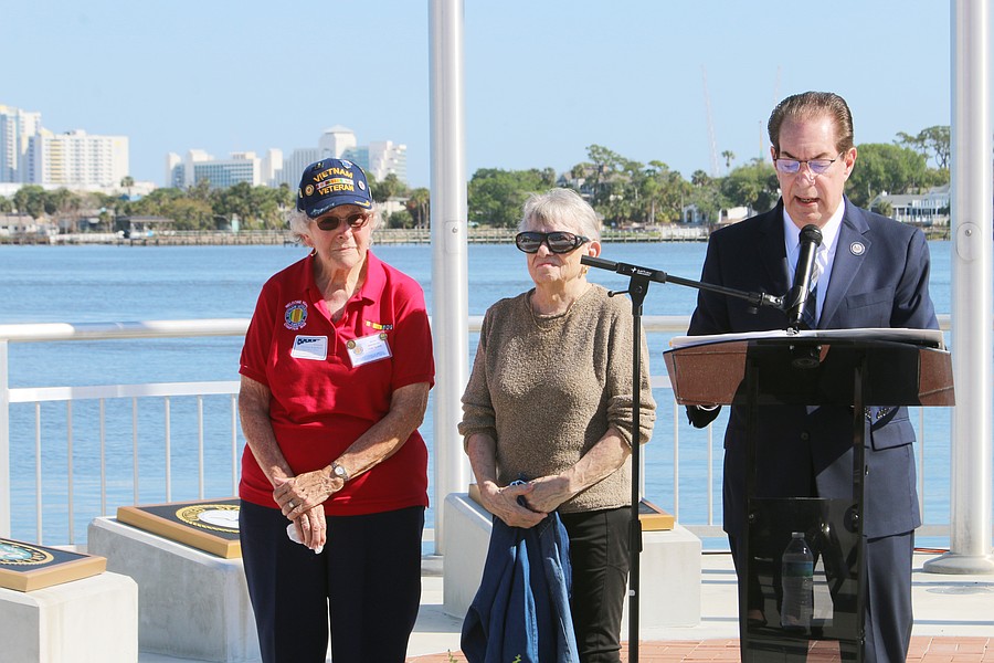 Ruth Brewster and Boris Jones-Pilcher are recognized by State Sen. Tom Wright during the Vietnam Memorial Wall unveiling ceremony at Veterans Memorial Plaza on Friday, March 27. Photo by Jarleene Almenas