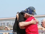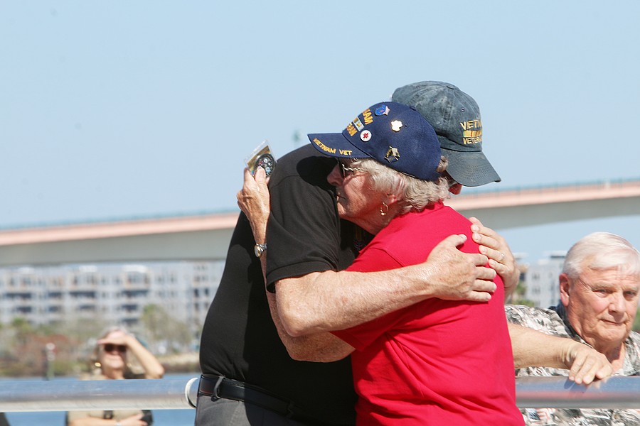 Ruth Brewster hugs her husband after her recognition during the Vietnam Memorial Wall unveiling ceremony at Veterans Memorial Plaza on Friday, March 27. Photo by Jarleene Almenas