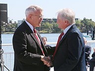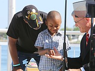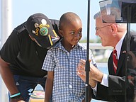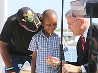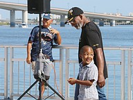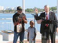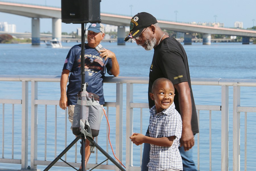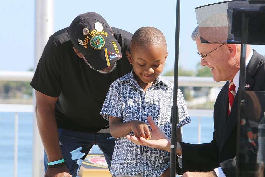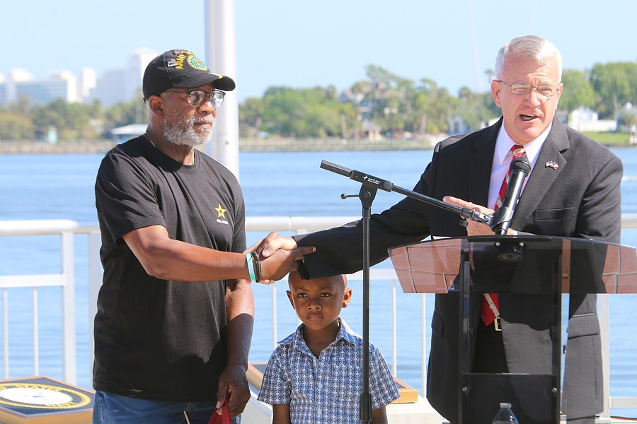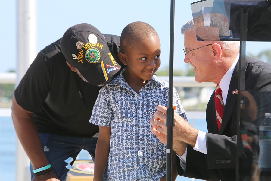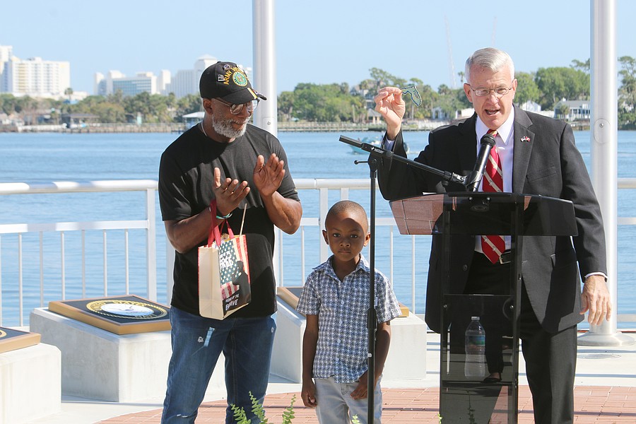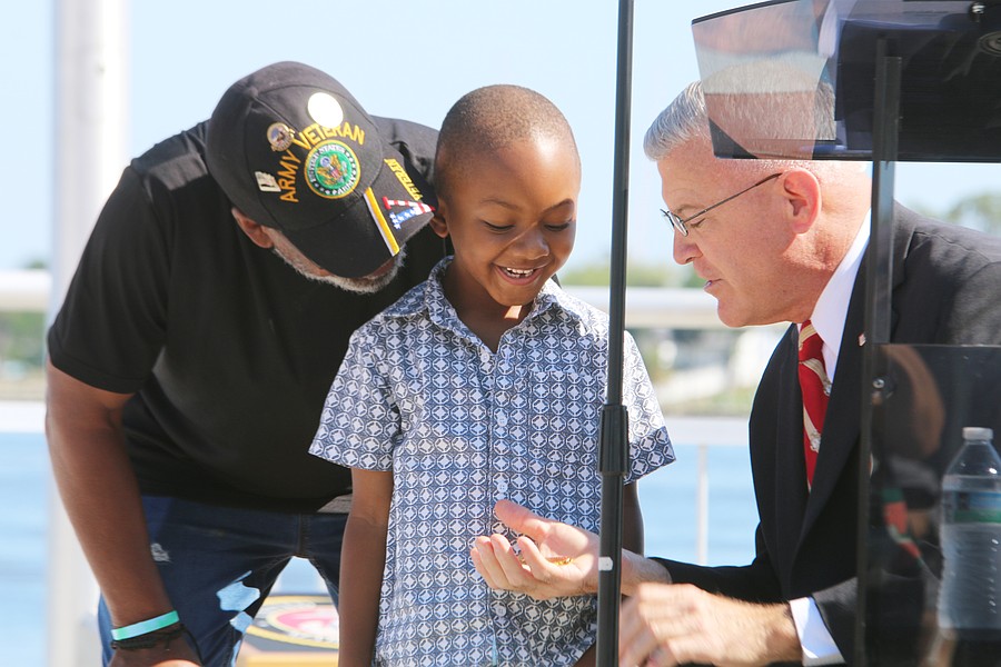 Gen. James Hartsell, executive director of the Florida Department of Veterans Affairs, brings up Keith Brooks and his grandson Denim Warren during the Vietnam Memorial Wall unveiling ceremony at Veterans Memorial Plaza on Friday, March 27. Photo by Jarleene Almenas