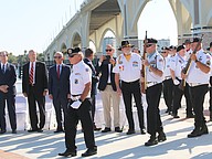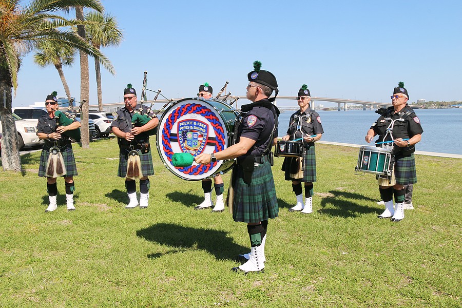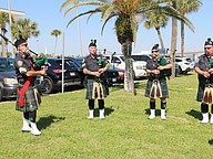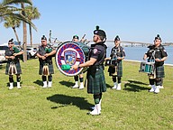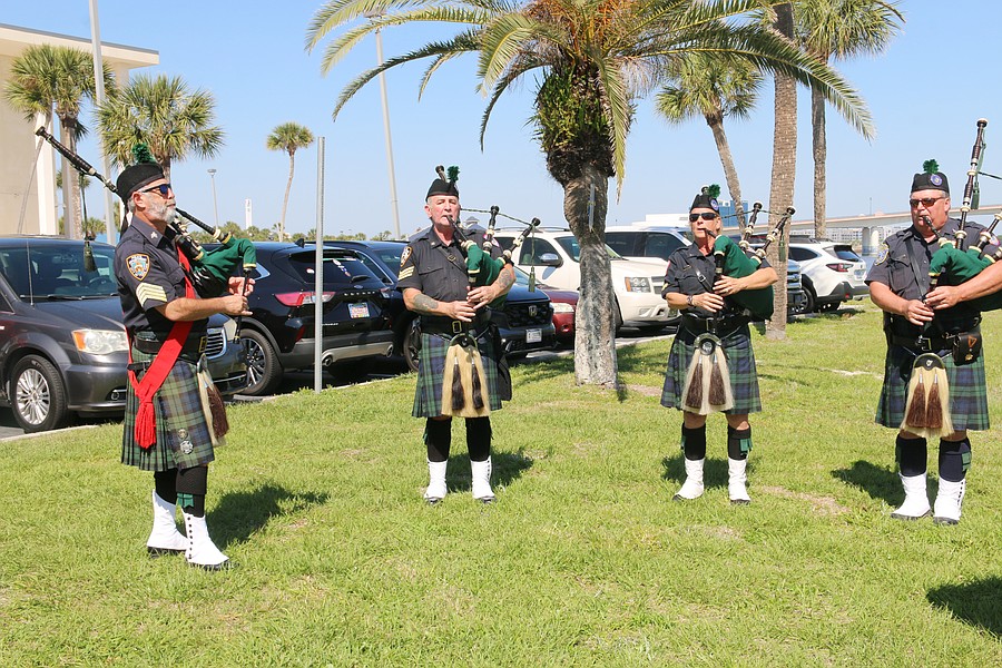 The Coastal Florida Police and Fire Pipes and Drums play "Amazing Grace" during the Vietnam Memorial Wall unveiling ceremony at Veterans Memorial Plaza on Friday, March 27. Photo by Jarleene Almenas