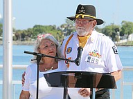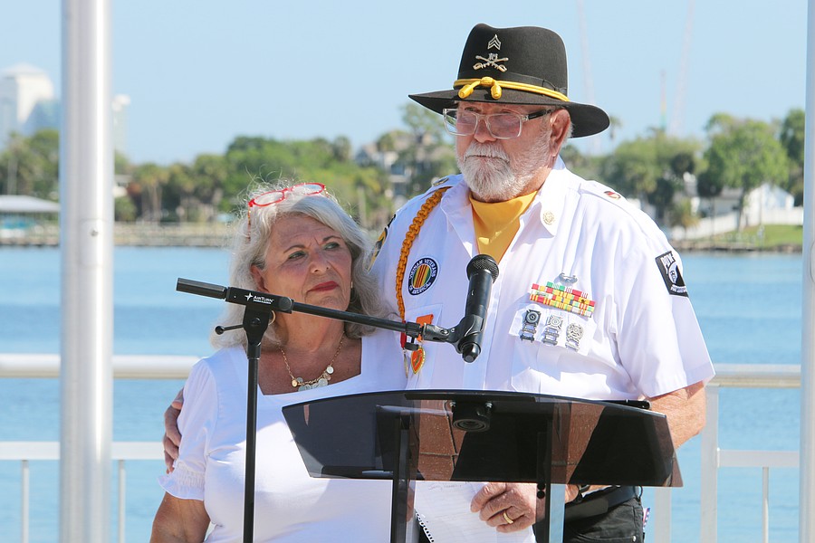 U.S. Army veteran Robert “Bob” Adkins speaks alongside his wife Cathy during the Vietnam Memorial Wall unveiling ceremony at Veterans Memorial Plaza on Friday, March 27. Photo by Jarleene Almenas