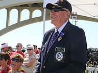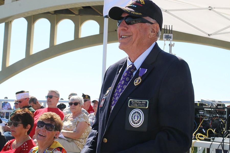 Rod Phillips stands for recognition during the Vietnam Memorial Wall unveiling ceremony at Veterans Memorial Plaza on Friday, March 27. Photo by Jarleene Almenas