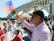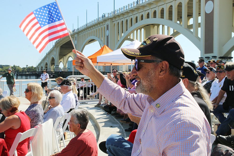 A veteran waves a flag during the Vietnam Memorial Wall unveiling ceremony at Veterans Memorial Plaza on Friday, March 27. Photo by Jarleene Almenas