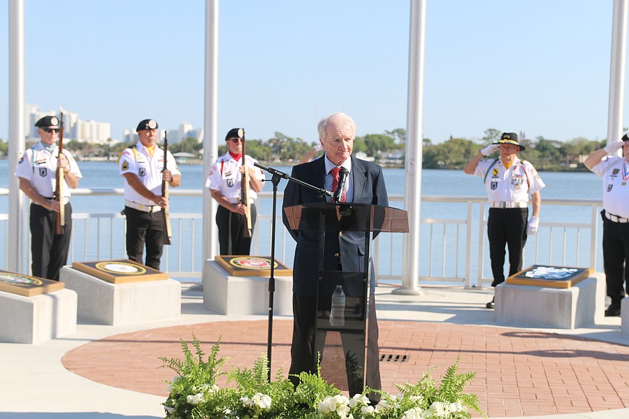 Gen. James Hartsell, executive director of the Florida Department of Veterans Affairs, speaks during the Vietnam Memorial Wall unveiling ceremony at Veterans Memorial Plaza on Friday, March 27. Photo by Jarleene Almenas