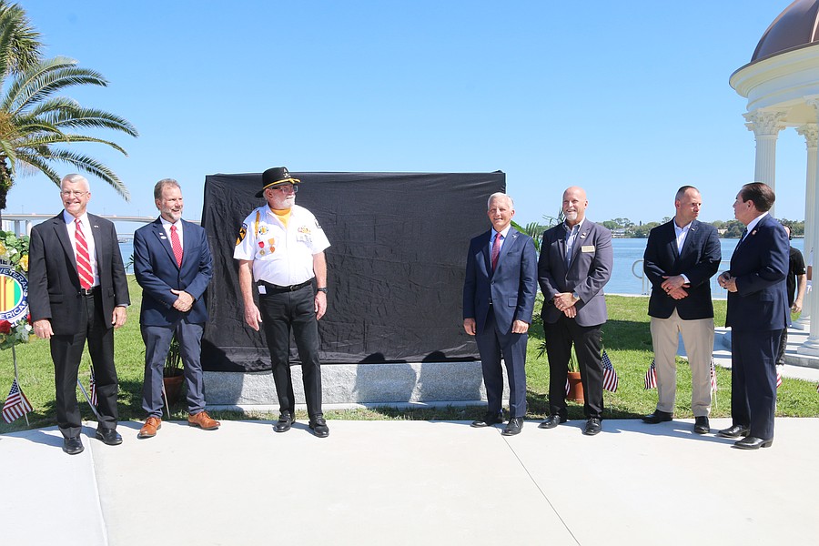 Gen. James Hartsell, executive director of the Florida Department of Veterans Affairs; Volusia County Council Chair Jeff Brower; U.S. Army veteran Robert “Bob” Adkins; County Councilman Jake Johansson; County Councilman Matt Reinhart; State Rep. Chase Tramont and State Sen. Tom Wright await the Vietnam Memorial Wall unveiling at Veterans Memorial Plaza on Friday, March 27. Photo by Jarleene Almenas