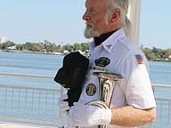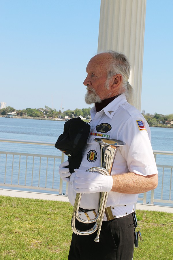Bob Bendlin looks on as the Coastal Florida Police and Fire Pipes and Drums play "Amazing Grace" during the Vietnam Memorial Wall unveiling ceremony at Veterans Memorial Plaza on Friday, March 27. Photo by Jarleene Almenas
