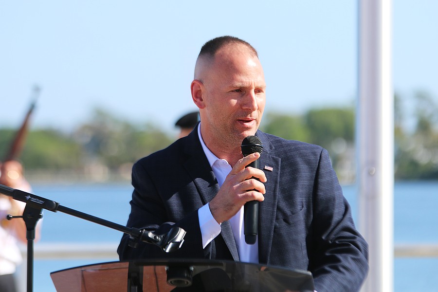 Florida Rep. Chase Tramont speaks during the Vietnam Memorial Wall unveiling ceremony at Veterans Memorial Plaza on Friday, March 27. Photo by Jarleene Almenas