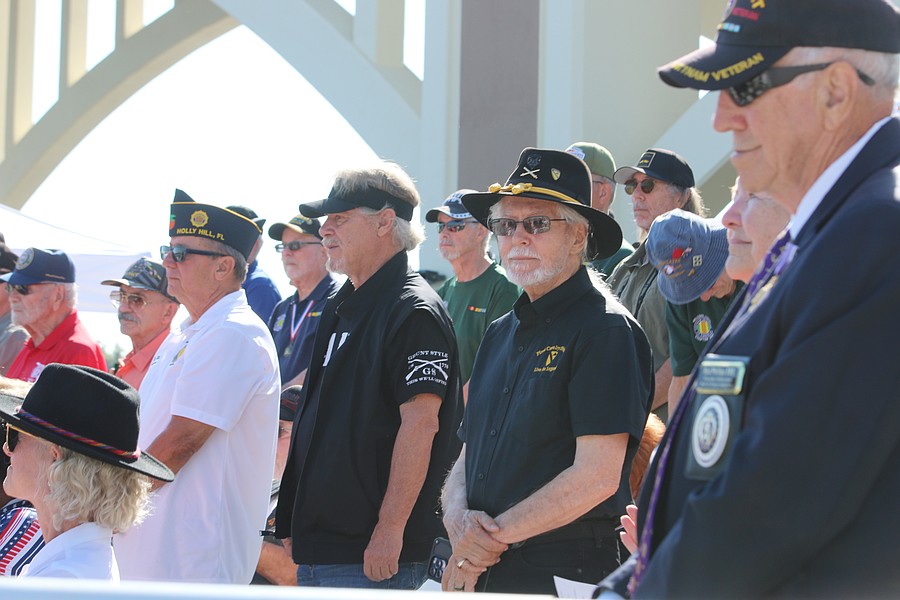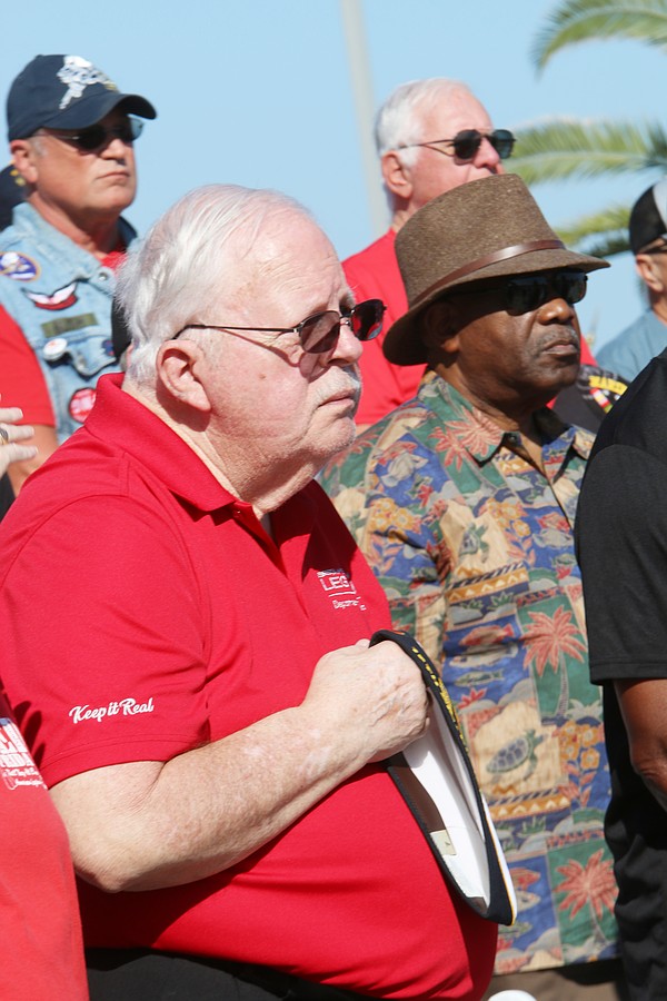 Florida American Legion 17th District Commander Jim Bowers listens to speakers during the Vietnam Memorial Wall unveiling ceremony at Veterans Memorial Plaza on Friday, March 27. Photo by Jarleene Almenas