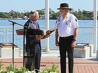 Gen. James Hartsell, executive director of the Florida Department of Veterans Affairs, recognizes Kevin Campbell for his rendition of the national anthem during the Vietnam Memorial Wall unveiling ceremony at Veterans Memorial Plaza on Friday, March 27. Photo by Jarleene Almenas
