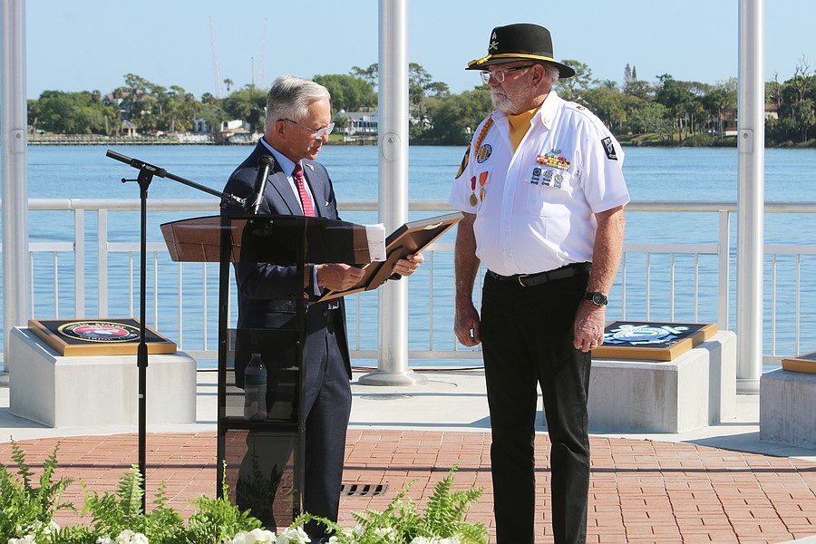 Volusia County Councilman Jake Johansson presents Bob Adkins, past president of the Vietnam Veterans of America Daytona Beach Chapter 1048, with a proclamation during the Vietnam Memorial Wall unveiling ceremony at Veterans Memorial Plaza on Friday, March 27. Photo by Jarleene Almenas
