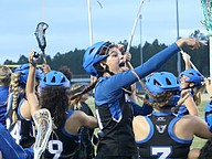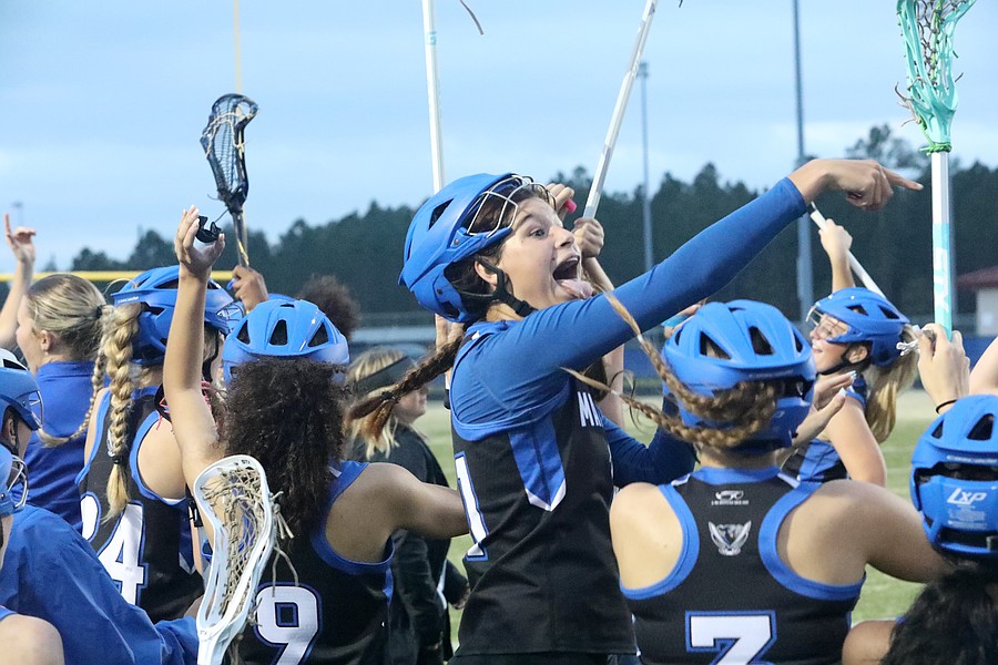 Matanzas' Addison Alred celebrates the Pirates' 10-5 girls lacrosse victory over Flagler Palm Coast with her teammates. Photo by Brent Woronoff