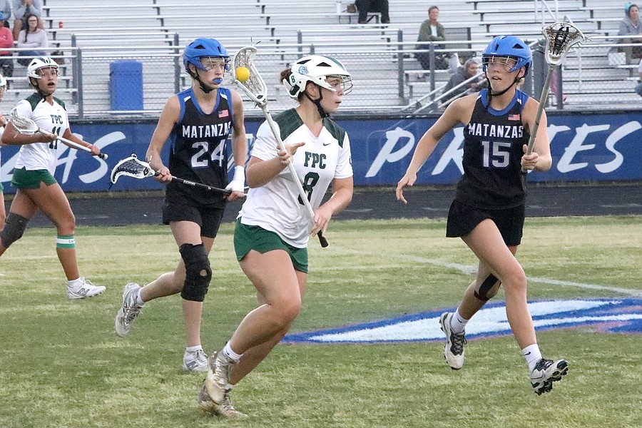 FPC's Brianna Long (8) carries the ball upfield as Matanzas' Kenna Hardee (15) and Trinity Johnston (24) defend. Photo by Brent Woronoff