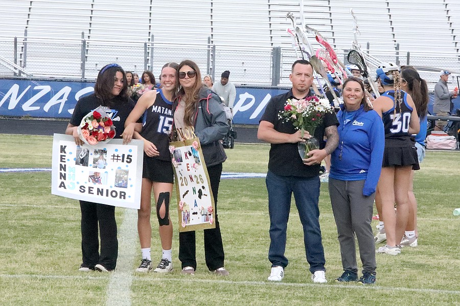Matanzas' Mia Apfelbach (center) is honored with her family during the Pirates' girls lacrosse senior celebration. Photo by Brent Woronoff