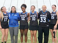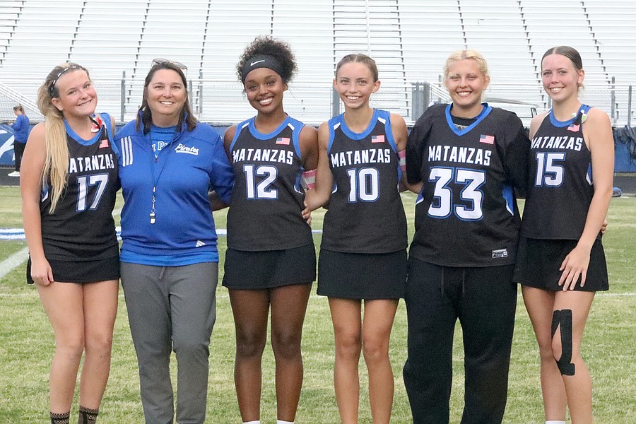 Matanzas girls lacrosse seniors honored on Senior Night: Taylor Openshaw (17), Paityn Lawrence (12), Mia Apfelbach (10), Taylor Basiger (33) and Kenna Hardee (15) with coach Brandie Alred. Photo by Brent Woronoff