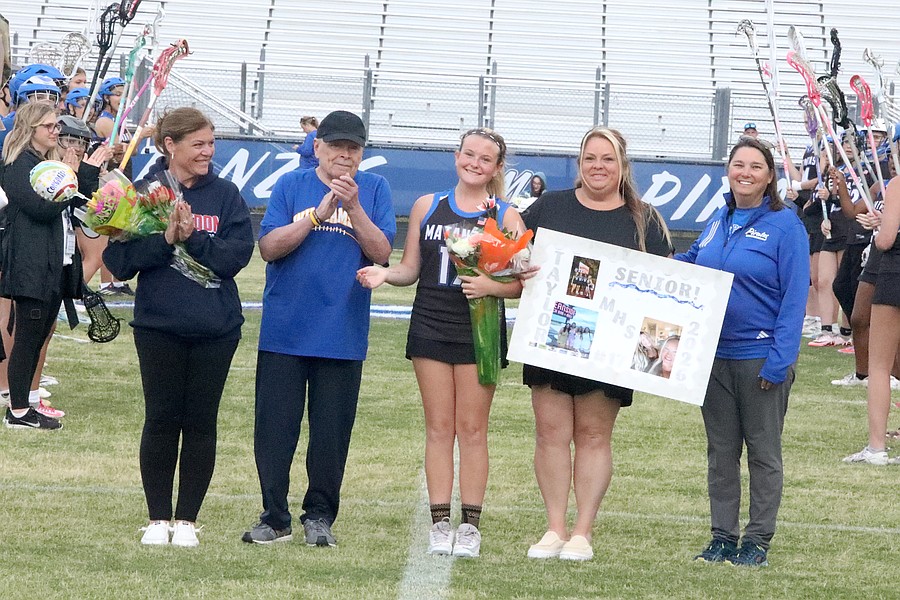 Matanzas senior Taylor Openshaw is honored with her family and girls lacrosse coach Brandie Alred. Photo by Brent Woronoff