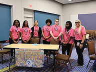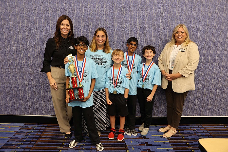 Kristy Castellanos, with Volusia County Schools; Tomoka Elementary team member Surya Patel, Yanelisi Brugone, team members Jacob Frankel, Millan Patel and Captain Daniel Lucas, and Leslie Frazee, with Volusia County Schools. Photo courtesy of Volusia County Schools/Facebook