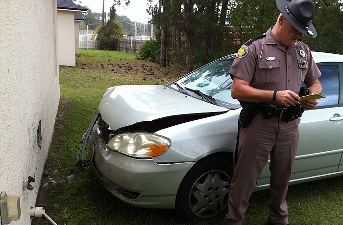 An elderly woman drove over a median, hopped a curb, plowed through a fence, sustained a three-foot drop and bonked into a house in the B-section at 12:40 p.m. Friday. She was taken to the hospital, but was feeling no pain and only had a small cut, according to the officers on the scene.
